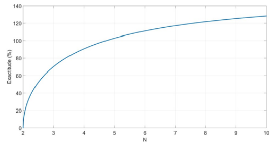 According to Figure 1, the optimal value will be N=5, with the very precise approximation of 97.25%.
