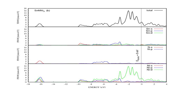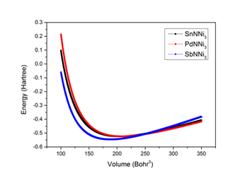 The unit cell of SnNNi3 compound is shown in Figure 1. The crystal structures of SbNNi3 and PdNNi3 compounds are the same with SnNNi3 compound as shown in Figure 1. In our case E21-type structure which is illustrated in Figure 1. The Wyckoff positions of atoms are located as follow: Sn (0, 0, 0); N (0.5, 0.5, 0.5); and Ni (0, 0.5, 0.5) (Figure 2). Firstly, the equilibrium lattice constants, bulk modulus and its pressure derivative have been obtained by minimizing the total crystal energy calculated for different values of lattice constants using the Birch-Murnaghan equation of states (eos)44 and the calculation results are given in Table 1 for cubic perovskite (E21) structure (space group Pm3 (221)) of XNNi3 (X=Pd, Sn and Sb). (Table 1) the present structural results are listed in the Table 1, along with the other theoretical and experimental works. The present lattice constants are obtained as 3.905 Å, 3.944 Å and 3.808 Å, respectively, for XNNi3 (X=Pd, Sn and Sb) compounds. Our lattice constants are very good convenient parameters with the other theoretical studies. Our lattice constants in E21-type crystal structure for SnNNi3 is nearly 0.127% lower, for SbNNi3 is nearly 0.051% higher and for PdNNi3 is nearly 0.132% higher than the reference value.28 These deviations may stem from the using of GGA approximations with different ab-initio codes. Additionally, the volume values and bulk modulus values of SnNNi3 compound are in convenient with other theoretical values and also the same values are in very good agreement of SbNNi3 and PdNNi3 compounds. The effect of hydrostatic pressure indicated by the derivative of bulk modulus under pressure (B´) is given in Table 1 for each of ternary nitride compounds. According to Table 1, the pressure derivatives of bulk modulus are calculated 4.440, 4.399 and 4.590, respectively, for XNNi3 (X=Pd, Sn and Sb) compounds and sequenced like as. The derivative of bulk modulus is evaluated with anisotropy. From Table 3, the anisotropy values of XNNi3 (X=Pd, Sn and Sb) compounds are, respectively, 1.19, 1.28 and 1.21. The magnitudes of anisotropy factors are arranged with. Due to both of these equalities, derivative of bulk modulus are confirmed by anisotropy as an expected. The thermodynamic stability of XNNi3 (X=Pd, Sn and Sb) compounds can be reflected by the formation enthalpy (∆H). Negative formation enthalpy has been explained as an exothermic process, and formation energy in the lower ones shows the stability related with the decomposition to the constituents of an element. The formation enthalpy could be expressed by the relation:45