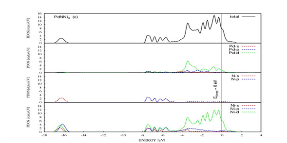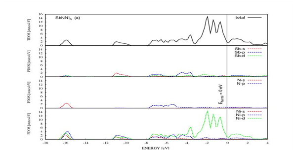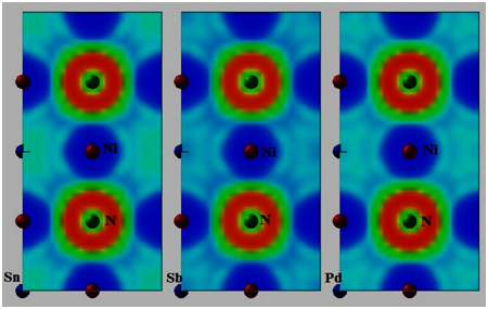 In this section, the main features of electronic properties of XNNi3 (X=Pd, Sn and Sb) compounds are described by analyzing the density of states as total and partial with their related charge densities in Figure 3 & Figure 4. The energy zero is chosen to be at the Fermi energy EF. All of the three total densities of states have nearly similar features. For all compounds conduction band minimum values are upper than from Fermi energy level. As a comparison of DOS of SbNNi3 with other compounds, its DOS is lower at Fermi energy level. The DOS of PdNNi3 are above at Fermi energy level according to SbNNi3 compound. These all compounds exhibit metallic character in consideration of rate for impletion at Fermi energy levels. The metallic behavior of XNNi3 (X=Pd, Sn and Sb) compounds are mostly owing to the addition of Ni-d states at the Fermi level and a little addition of Pd-d states for PdNNi3 compound. It is clearly seen that Sn-s state and N-p state contribute at Fermi level, and this emerges to a sp-hybridization between metal-s state and N-p states. As it is seen from partial density of states explanations, owing to the covalent bonding, there is hybridization and clarifies the charge densities in Figure 4. The lower valance band is because of the 2s-states electrons for XNNi3 (X=Pd, Sn and Sb) compounds. The charge densities of XNNi3 (X=Pd, Sn and Sb) compounds are depicted in Figure 4. The computed charge density distributions are evident that the covalent bonding that nature of our three ternary nitrides is obtained as covalent due to the sp-hybridization that is also confirmed by partial density of states plots. It is easy to observe that from Figures 3 and 4, the SbNNi3 compound is much more covalent according to PdNNi3 and SnNNi3 compounds. The charges are more accumulated between atoms. Moreover, a high ratio of G/B is related with brittleness. Considering that SbNNi3 compound has the greatest value of G/B, consolidates that SbNNi3 compound has more covalent character than PdNNi3 and SnNNi3.