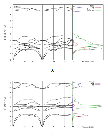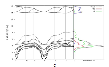 The phonon dispersion curves of XNNi3 (X=Pd, Sn and Sb) were obtained using by the PHONOPY code.53 The partial atomic phonon density of states (DOS) for XNNi3 ternary nitrides were calculated along the high symmetry directions using a 2x2x2 super cell and given in Figure 5A-5C. The 0.03 Å for displacement is adopted for each atom of the 2x2x2 supercell in to determine the forces of the atoms. The primitive cells of XNNi3 contains 5 atoms with 15 phonon branches have 3 acoustic and 12 optical modes. For PdNNi3 compound, a gap between acoustic and optic modes is found in the phonon dispersion curves owing to the bigger ratio of mass cation and anions. But, accordin to the SnNNi3 and PdNNi3 compounds there is not a gap between acoustic and optic modes. The lack of soft phonon imaginariy modes in the phonon spectra that supports the stable character as dynamically for the XNNi3 (X=Pd, Sn and Sb) nitrides. In the literature, there is no study of the lattice dynamics of these compounds to compare with our data. It can be seen from Figure 5 that the low-lying optical phonon modes have interactions with phonon modes for SnNNi3 and SbNNi3 as the acoustic. For the phonon DOS of XNNi3 ternary nitrides the acoustic modes are emerged by the vibrations of Sn, Sb and Pd atoms, while the optical modes are emerged by the vibrations of Ni atoms at low modes, with less addition from N and Ni atoms. At higher optical mode, the main contributions emerge from N atoms, with less contributions comes from Ni atoms. PdNNi3 has upper phonon energies than SnNNi3 and SbNNi3 at Gamma point. The main distinction of the three nitrides is due to difference in the chemical bonding and masses for XNNi3 (X=Pd, Sn and Sb) nitrides (Figure 5).