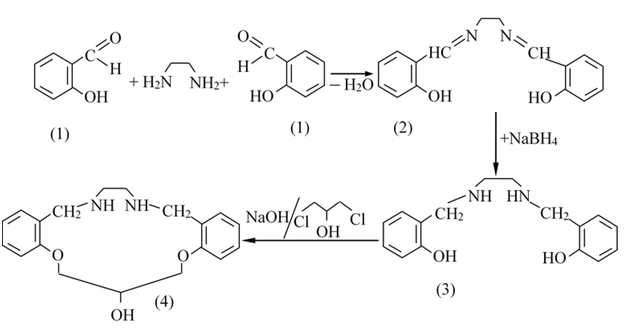 Antibacterial activity of MC andMC@Fe3O4 was tested by diffusion method, performed on Petri dishes, on Staphylococcus aureus, Klebsiella spp. and Escherichia coli6 The synthesized substances were taken in amount equal to 30μg. Escherichia coli were cultivated on Endo's medium, Klebsiella spp. on Sabouraud medium and Staphylococcus aureus on Baird-Parker agar (cultures were kindly provided by one of the clinical laboratories of Baku, Azerbaijan). Due to the fact that this method provides only quality data, micro dilution method was also performed. By this method the MIC of prepared substances on Staphylococcus aureus, Klebsiella spp. and Escherichia coli was identified. To perform micro dilution method the stock solutions of different concentrations of the substances were prepared in distilled sterile water and were distributed in 96 multi-well plates. Each well was inoculated with 0.1mL of microbial suspensions of 0.5McFarland turbidity, prepared from 24h fresh culture. Sterility control wells and microbial growth controls were involved. The plates were incubated for 2h at 37˚C. In order to measure antibacterial effect on bio film development, wells were washed with PBS three times, dried for 15 minutes in room temperature and stained by crystal violet 1% for 15 minutes. After the deletion of crystal violet 1%, wells again were washed 3 times with PBS and dried at room temperature for 15 minutes. Further, the bio film, formed on the plastic wells, was re-suspended in 30% acetic acid and the intensity of the colored suspension was assayed by measuring the absorbance at 590nm.7 Synthesis of MC 1,13-Diaza-5,9-dioxa-7-hydroxy-3,4:10,1-dibenzocyclopentadecan (4) is depicted on the scheme 1. N,N' ethylenebis(salysilimine) (2) was prepared by condensation of salysilaldehide (1) with ethylenediamine. The reduction of (2) was carried out by sodium borohydride. The ring closure step was carried out by reaction of corresponding saturated derivative (3) with 1,3-dichloro-2-propanol.