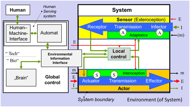 The sensor-actor system under study („System“) is defined by the system boundary (thick black line), crossed by flows of energy E (red arrows), mass m (black) and information (green). In the environment of this system, the „Global control“ as a seperate system interacts via an „Environmental Information Interface“. The global control is abstracted for a biological solution („Bio“: „Brain“) and a technical solution („Tech“: an „Automat“). This automat may interact in a „Human Serving System“ with human beings via a „Human-Machine-Interface“. The sensor chain (yellow) is actuated („A“, „Adaptorics“, light green), the actor chain (orange) is sensorized („S“, „Interoception“, light green).