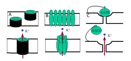 Thus, these transmitter-gated ion channels work as chemo electric transducers. There are several molecular mechanisms of opening and closing of natural and artificial ion channels.2 Channels can be opened or closed as a result of aggregation – disaggregation of molecular subunits constituting a channel (Figures 1A & 1B) or, a molecular gate can control the closing and opening of the channel (Figure 1C). A model system with an antibiotic, gramicidin, where two half-channels connect up, was used to construct a biosensor.3 The “off” state of the channel was realized by the displacement of one-half of the channel due to binding of the analyte.