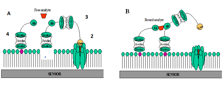 The cholesterol molecule holds the aggregated channel open by zipping the amphotericin molecules together (Figure 3A). When the channel is open, ions can pass through. When the analyte binds the antibody, it displaces the cholesterol and unzips the channel. This results in disaggregation and closing of the channel (Figure 3B). The process is reversible. When an antibody is unbound, the liberated cholesterol can again zip the channel open. The NORMALLY “OFF” switch is constructed as a modular assembly of a small artificial channel and a synthetic molecular gate tethered to the base of the supporting membrane. The channel opens when the target binds the sensing molecules and pulls the plug out of the channel.