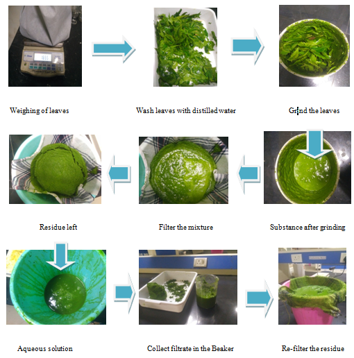 The Azadirachta indica leaves from the trees were collected. It was made sure that the stems and midribs are excluded. Azadirachta indica leaves amount were weighted by using weighing machine. The leaves were washed by distilled water 2 to 3times to remove dirt and foreign particles. The leaves were crushed and grinded in a mixer by adding small amount of distilled water to make a semi-solid paste. A cotton cloth was suspended over a big enough bucket to collect the extract. The mixture was placed on the cloth to filter the extract. The cloth was left with material suspended over the bucket or tub and latter was left to steep overnight in refrigerator. Aqueous filtrate was collected in the bucket and thus the strong and powerful Azadirachta indica extract was obtained. To filter the aqueous crude extract of Azadirachta indica, leaves were ones again added with more water to collect the residue in the cloth to filter out the remaining extract in the bucket. Or alternatively, we could just put the cloth inside a bucket or tub and steep it overnight. For the best use of the watery extracts, one can easily prepare the Azadirachta indica extract freshly as and when needed. The volume of leaves needed for the formation of extract is quiet high. Collected Azadirachta indica leaves from trees weighs 165grams. Since 50grams of Azadirachta indica leaves are required for use in 1L of extract. 330L of extract was collected and measured in beaker to form a solution of 50g/L. So the concentration of the aqueous solution of Azadirachta indica extract is 0.05gram/mL. Boiling the extract is unnecessary as it reduces the azadirachtin content. Thus, cold extract is preferred. The filtrate is then stored in a can and refrigerated (Figure 3).
