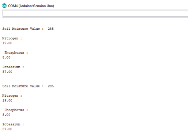 The PC displays the value of soil moisture values along with the NPK values. The arduino code is also encoded with the language commonly known as embedded C. The analog to digital converter is also provided.