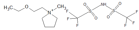 Synthesis of 1-(2-ethoxy-ethyl)-1-methylpyrrolidinium bis(trifluoromethylsulfonyl)imide,[C2OC2C1pyrr][N(Tf)2]: Lithium bis(trifluoromethylsulfonyl)imide (143.54 g, 0.5 mol) was added to a solution of [C2OC2C1pyrr]Cl (69.28 g, 0.35 mol) in dichloromethane (100 mL). The mixture was stirred for 48 hours, and then filtered. The residual salt was washed with dichloromethane (2 x 30 mL) and the organic extracts were combined. The organic extract was washed with water until the aqueous phase was halide free (silver nitrate test). The solvent was removed by evaporation. The resulting liquid was stirred with activated charcoal for 24 hours. After removal of the charcoal by filtration through a glass fiber membrane, the ionic liquid was dried in vacuum at 45°C for 48 hours to give 1-(2-ethoxy-ethyl)-1-methylpyrrolidinium bis(trifluoromethylsulfonyl)imide (97.2 g, 72 %) as a colorless liquid.