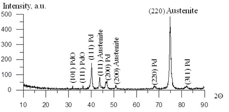 Figure 1, as typical example, the diffractogram of a sample synthesized by impregnation a second component (Pd) onto a molybdenum implant (Mo/SS) is shown. It is possible to see that only reflexes of austenite (support) and compounds of deposited metal (phases of metallic palladium and its oxide) were observed in the X-ray. It is necessary to note that the absence of implants reflexes for substrates (Mo/SS, Ni/SS, Al/SS) with Mo, Al, Ni implanted was shown in.11,14 For palladium crystals, there are reflexes of planes (111), (200), (220) and (311).15 The calculation by the use of the Scherrer equation (plane (111) with the maximum reflex intensity) shows that the size of the primary crystals Pd is 19-21 nm, but they can form larger aggregates (crystallites). Low-intensity reflexes of palladium oxide refer to planes (101) and (111).16The calculation shows that palladium oxide exists in the form of larger crystals (about 86 nm) than the metal. Thus, the deposition of palladium does not lead to a change in the state of the implanted metal, whose reflexes are still absent in the diffractogram. The study of substrates surface using optical microscopy shows that the implantation of nickel ions (Figure 2) and molybdenum (Figure 3) leads to a double effect (two different samples are presented for each of the elements, synthesized under the same conditions). The fact that the effect of the formation of secondary defective structures is related to the nature of the implant is confirmed by the data obtained for samples that were synthesized by consecutive implantation of aluminum and nickel (Figure 3). On Ni/Al/SS secondary defects occur in nickel implantation and this effect is increased in comparison with mono-implanted nickel. The emerging combs acquire larger values from height and area of their surface. When palladium is deposited, for example, where aluminum and nickel have been previously sequentially implanted, the grouping of defects is larger and less uniformly distributed over the surface (Figure 4). This is explained by the concentration of new formations near defects that occur after the implantation of nickel.