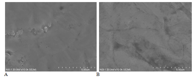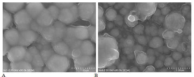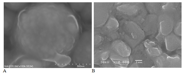 Since the resolution of the visible microscopy was small for the determination of local changes in the surface morphology during metal implantation. So, a study of samples was carried out using the SEM method. In accordance with the data obtained earlier, the results of SEM also show that the implantation of nickel leads to the formation of new, sufficiently large defects in the surface structure (Figure 5). At the same time, the number of these defects and their depth increase in the case of preliminary aluminum implantation in the surface layer of the carrier (Figure 5). That is the heterogeneity of the surface of the synthesized implants greatly increases. When palladium is deposited by impregnating on surface of samples with implanted nickel or with consecutive implanted aluminum and nickel the formation of its individual particles (metal and its oxide, according to the XRD given above) having a globular form was observed (Figure 6). In the case of Ni/SS substrate use, the distribution of particles of palladium (its oxide) in size is more uniform, from 300 to 500 nm. In the second case (using a substrate with successively implanted two elements), the difference in the sizes of the palladium particles is a greater and their dimensions change from 100 to 600 nm (Figure 6). Perhaps this is due to more heterogeneity of the substrate surface when two metals are implanted. At the same time was established that large particles of palladium (larger than 500 nm) present conglomerates from primary particles having a diameter of 50-100 nm (Figure 7) which confirms the calculations from XRD data given above. Thus, the realized studies shown that preliminary implantation of metal ions (Ni, Al, Mo) into steel creates the conditions for formation of palladium nanoparticles rounded form with sizes up to 100 nm on the support surface easy impregnation method. In the case of palladium deposition on support without preliminary metal implantation the indefinite particles of palladium with dimension more than 1 cm were formed (Figure 7B). So, the preliminary implantation permits to create particles of the smallest size.