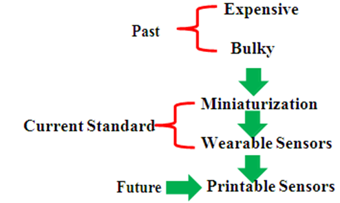 Sensors play a very vital role in the wellbeing of human lives. From daily household activities to industrial process, sensors are the part and parcel for continuous and sustainable development. Spanning a wide range of fields such as chemical, physical as well as biophysical; it has become ubiquitous. As for instance, numerous sensors and sensory schemes have been reported for assessing temperature; humidity; pressure; heavy-metal ion sensing as well as in various healthcare systems.1–12 When we talk about a sensor; the point-of-care approach is always preferred. The healthcare industry is slowly beaming with innovative concepts. Accordingly, this concise communication outlines the transition phases of sensors used in health care system. Apart from this, it also briefs the recent progress in the area of printable sensors. The transition phases that the sensing schemes are now undergoing is well displayed in Figure 1. As rightly pointed out in Figure 1, earlier sensors used to be bulky as well as very expensive. Hence, they were not portable as well as sensitivity also remained very low. With growing demand in healthcare system, there had been some radical changes such as portability as well as superior detection ability. However, they have not been adequate to mollify the growing health industry. Of late; miniaturization with minimal accessories has become the need of the hour. Slowly, rigid as well as voluminous sensory schemes are becoming obsolete nowadays as everyone is more accustomed to hassle free and comfy wears. Taking cue from this, manufactures have now resorted to making wearable devices such as smart watches, fit-bit etc.