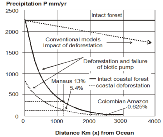 Figure 1 Deforestation impact according to the biotic pump theory. Makarieva & Gorshkov (Makarieva A. M., 2007) use a length, l, of 600 km, as the distance over which a molecule of water will evaporate and fall-out through precipitation. The formula, describes the reduction in precipitation as the distance increases between the coast and inland.