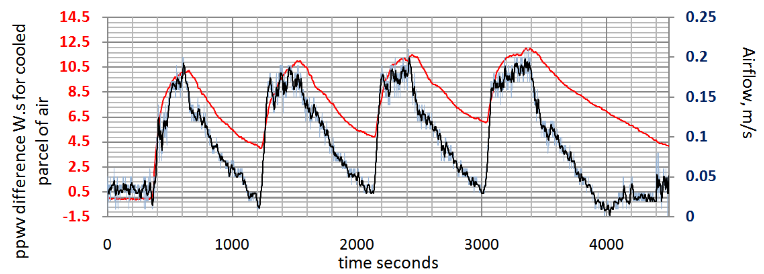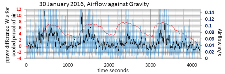 Figure 4 Experiment 30th January, 2016. The left-hand axis shows the partial pressure change as a parcel of air is cooled. The right-hand axis shows the airflow. During the four refrigeration cycles the airflow is directed upwards, against gravity and therefore requires additional work for the air to move.