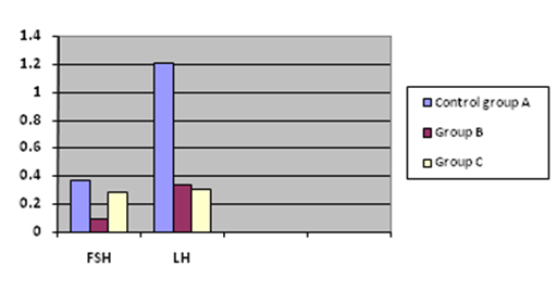 Serum LH level was significantly reduced (P < 0.05) in Group B (0.34 ± 0.06 miU/ml) and Group C (0.31 ± 0.03 miU/ml) compared to control group A (1.21 ± 0.60 miU/ml). The serum LH level was not significant (P > 0.05) in Group B compared with Groups C rats.