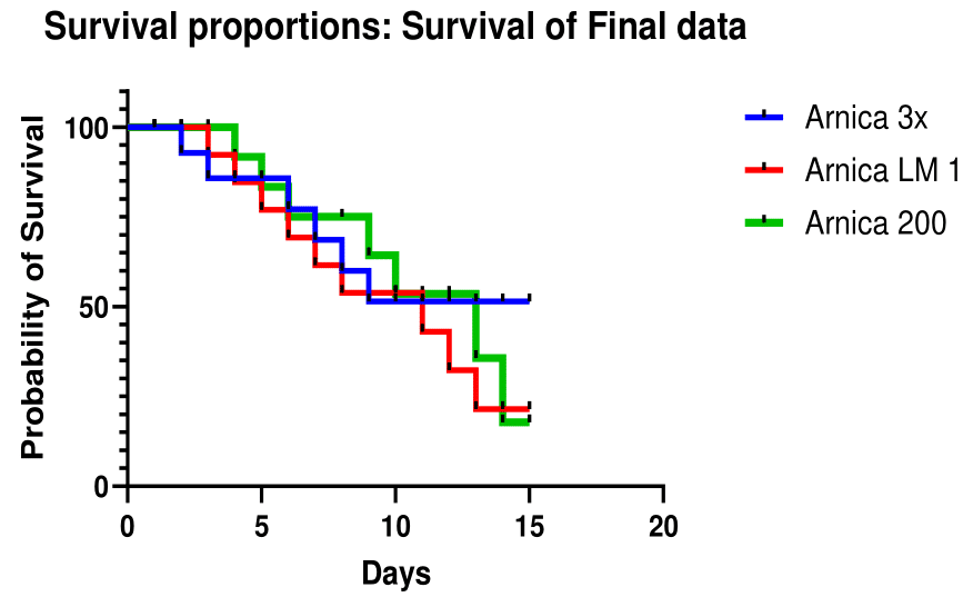 Methodology: On the basis of pre-determined criteria, between 1st January 2010 and 31st May 2023, 30 patients admitted to intensive care units in various hospitals of Delhi received adjunct Arnica montana in 3x (Group A, n=10), LM1 (Group B, n=10) and 200C (Group C, n=10) potencies. Clinical recovery was estimated through changes in the Glasgow Coma Scale (GCS) score daily over a period of 15 days. Clinical recovery time was assessed using Kaplan-Meier survival curves.
