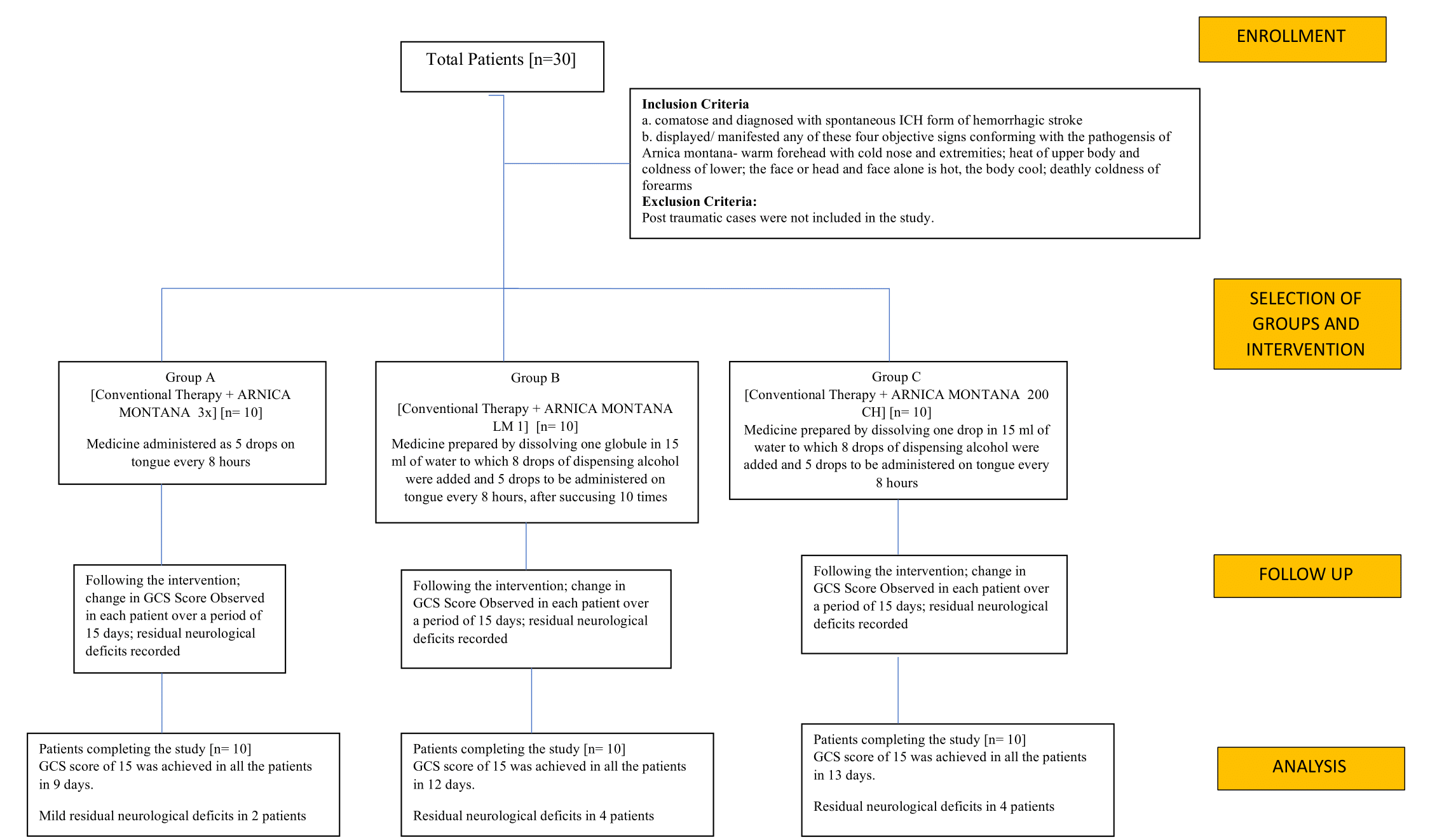 On 1st January 2010, while the author was employed with the Department of Ayush, Government of Delhi as a Senior Medical Officer (Homeopathy), he was called to consult for a below-poverty line comatose case of 49 years old male who had extensive ICH and was admitted to the ICU of a Government hospital in Delhi, with a grim outcome. On the insistence of family/ attendants and with the approval of treating doctors (obtained by them), after recording anamnestic psycho-somatic case profiling as per the guidelines of homeopathy, and observing the characteristic indications, he was prescribed Arnica montana 3X, 5 drops on tongue every 8 hours. A favorable response to the adjunct homeopathic treatment, paved the way to its application in various private and Government owned hospitals in Delhi, referred mostly by gracious patients/ attendants and a few even by nursing staff who observed the favorable effects of this adjunct therapy. The study was continued even when the author resigned from Government service and established his personal Holistic Homoeopathic Clinic and Research Center in Delhi on 1st August 2016. The last patient for this observational study was recruited on 25th April 2023.