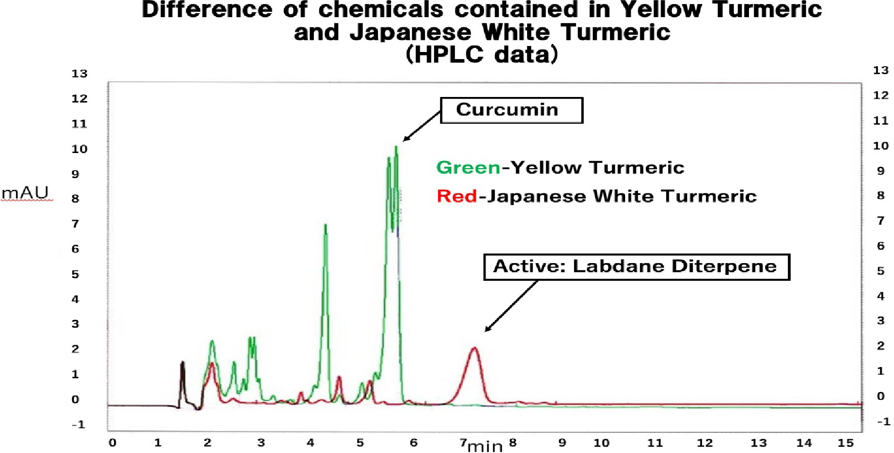 Figure 1 HPLC chromatogram, giving the retention time of curcumin and labdane di-terpenoids in yellow turmeric (green) and White Japanese Turmeric (red).