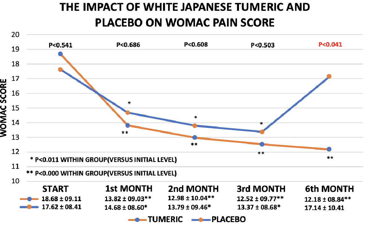 The overall impression of this clinical trial is that White Japanese Turmeric (WJT) seems to improve symptoms of osteoarthritis and reduce the consumption of rescue medication in patients with osteoarthritis (OA). This is evidenced from the data after three months treatment and onward indicating that active treatment was superior to placebo when testing pain on a numerical axis, the activity of daily living (ADL), patients global assessment of disease severity (PGAD) and the evaluation of how patients felt treatment worked (HTW) and by the more than 50% reduction in the consumption of paracetamol observed in the actively treated group (details in Tables 3 and 4 and in Figure 5). After six month of treatment the results seems even more convincing as WOMAC pain at this time point was also statistically significant superior to placebo. However, the six-month data should be taken with some precaution as at that time the number of volunteers in each group was not any longer sufficient to create the same power as observed after 3 months. For details see Figures 3-5 and Tables 2-4.