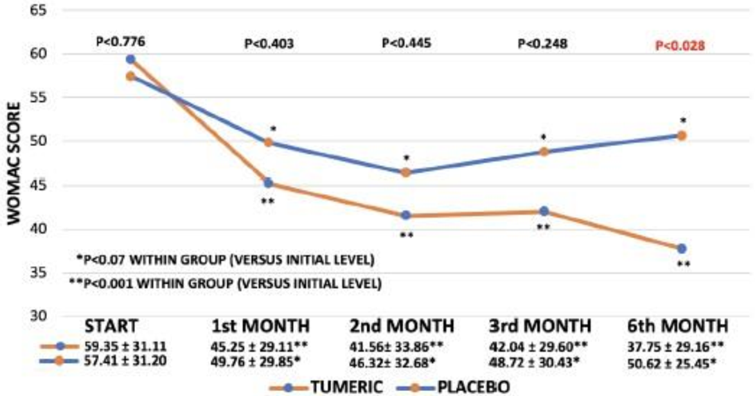 The reduction of WOMAC pain as the result of white turmeric treatment, was further supported by additional pain scores taken upon inclusion and again after 3 and 6 months, respectively using a numerical scale focusing on the worst experienced pain during the last 7 days (details in Tables 4a and 4b). Using a numerical scale from 0-10 (10 worst possible) we were able to distinguish between active and placebo treatment after already 3 months indicating that possibly visual analogue scales (WOMAC) and numerical scales used together on the same group of volunteers can give us a wider impression of the sensation of pain than each scale alone.