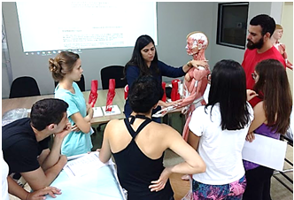 In addition to this workshop that provided a review of postural structures, a meeting was held for a specific study, where one student was the subject to be evaluated and the other examiners. With the help of the anatomy atlas, students identified the subject's back and, through inspection and palpation, the proximal and distal insertions of the superficial muscles of the back. We can see this moment in Figure 4.