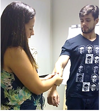 After this workshop, which promoted knowledge of the auricular pavilion and the nervous system that has influence on it, we started to experience reflexology and auriculotherapy. The basis of application at the outpatient clinic was the material prepared by the Federal University of Santa Catarina (FUSC),27 which defines it as "a microsystem therapy, which uses the auricular pavilion to diagnose and treat dysfunctions of organic, nervous or somatic origin".27,38 In this workshop, Traditional Chinese Medicine, which has been conducting studies and therapeutic practices for more than 2000,000 years, and the French school of Paul Nogier, in 1957, were covered.28 At the time, the students were able to know the instruments used and live the experience, under the supervision of the teacher trained in this therapy, as we can see in Figures 9 & 10.