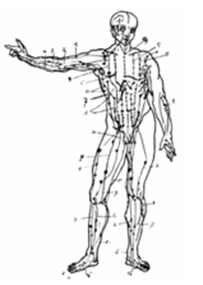 Presenting the body’s surfaces in this manner was not intended to indicate the anatomical paths of deeply lying structures but rather to present the observer with an understanding of something more functional in terms of the relationship of the body to the environment. For example, our understanding of the nervous system and withdrawal reflexes today suggests the effects of an acupuncture needle applied anywhere along at least some of the length of a surface of the body that presents in the same direction might well inhibit underlying agonist muscles and other neural inputs underlying that surface and facilitate the coordinated actions of antagonist muscles to withdraw the body from the noxious stimulus.
