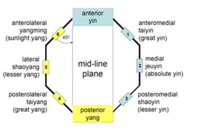 The idea that the Chinese practitioners were interested in the direction surfaces of the body faced becomes more probable when one considers special names they gave. For example, while standing with one’s back to the sun at noon, the anterior and medial surfaces tend to be kept in the shade; so these surfaces were titled yin. Conversely, the posterior and lateral surfaces of the body and limbs were exposed to the sun and were therefore called yang – see Figure 4. Furthermore as Figure 5 reveals, six surfaces of each limb were given special yin and yang titles: 1) the most shaded anteromedial surface was titled taiyin (great yin); 2) the less well shaded medial surface was called jeuyin (absolute yin); 3) being even less in the shade the posteromedial surface was said to be shaoyin (lesser yin); 4) the posterolateral surface received the most sun and was therefore called taiyang (great yang); 5) the lateral surface seeing somewhat less of the sun was given the title shaoyang (lesser yang); and finally 6) the anterolateral surface received even less exposure so was called yangming (sunlight yang).