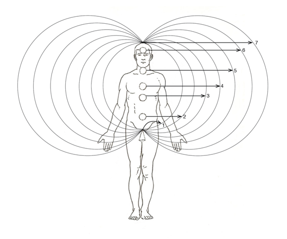 The human body breathes energy in through the vortices and energy out through the anti-vortices. Each of these six alternating spinning energy centers along the backbone rules an endocrine gland. They are called in ancient Hindu texts “chakras”, which in the Sanskrit language means “spinning wheal”. The seventh chakra on top of the head is called “point of union” because it unites the energies of all 6 underlying chakras.