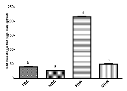The total phenolic content of the crude extracts is shown on Figure 1. Field bark water extract (FBW) yielded the highest phenol content (215.44 GAE mg/g) followed by market bark water extract (MBW) with phenolic content of 49.65 GAE mg/g of extract. Field bark ethanol extract (FBE) had total phenolic content of 39.65 GAE mg/g and market bark ethanol extract (MBE) had phenolic content of 27.193GAE mg/g of extract. The results showed that the water extracts had higher total phenolic content than the ethanol extracts. This might be due to the presence of water soluble phenolics in Pterocarpus erinaceus bark.