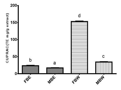 Figure 3 Cupric ion reducing antioxidant capacity (CUPRAC) (mg/g) of Pterocarpus erinaceus bark extracts FBE, field bark ethanol extract; MBE, market bark ethanol extract; FBW, field bark water extract; MBW, market bark water extract