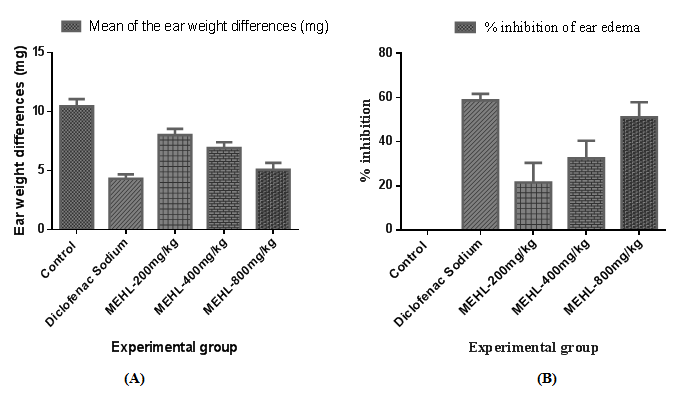 Xylene-induced-ear edema test: The acute anti-inflammatory activity of methanolic extract of Euphorbia hirta leaves was evaluated by xylene-induced ear edema in mice. An established method described previously by Dai&Liu25 was followed here with slightly modified form. Consisting of five mice in each group, twenty-five mice were randomly divided into five groups and had been fasted for 16h with water ad libitum. Group I was orally treated with distilled water (10mL/kg body weight) as negative control. Mice of group II were orally treated with Diclofenac sodium (DS, 100mg/kg body weight) and considered as positive control or standard. Test groups (group III and group IV) were orally administered with MEHL at dosages of 200, 400 and 800mg/kg body weight. Acute ear edema was induced by topical application of 20𝜇L of xylene on the anterior and posterior surfaces of the right ear lobe of each animal, after one hour from respective treatment. The left ear was untreated and regarded as control. Mice were sacrificed (1hour later of xylene application) by cutting off both ears with the utilization of 5 mm circular sections. Finally, the cut portion of each ear was seized and weighed accurately. The weight of ear edema was calculated from the difference between the weight of xylene treated ear (right ear) and the weight of untreated ear (left ear).26