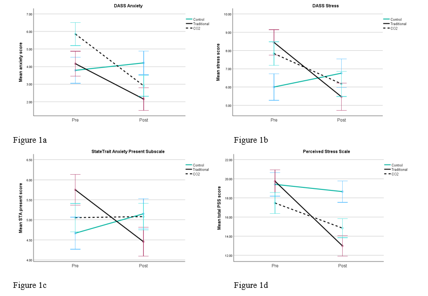 The pre-post*Group interaction was significant, F(2, 108) = 4.653, p = .012, ƞ2p = .079. Analysis of simple main effects indicated that for the traditional essential oil group the decrease in anxiety from pre (4.17) to post (2.14) treatment was significant, p = .014, Cohen’s d = .484, 95% CI [.135, .826], a medium effect size. For the CO2 group the decrease from pre (5.86) to post (2.91) was significant, p < .001, Cohen’s d = .490, 95% CI [.167, .808], a medium effect size. The control group elicited no significant difference p = .616, Cohen’s d = -.115, 95% CI [-.457, .228]. See Figure 1a.