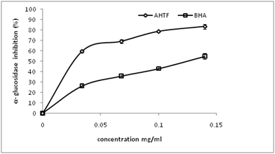 The inhibitory effect of AHTF and BHA on α-amylase and α-glucosidase enzymes is shown in Figures 3 & 4. The result revealed that both extracts inhibited both α-amylase and α-glucosidase enzyme activities in a dose dependent manner (0-0.14mg/ml); however as revealed by the IC50 values in Table 2, AHTF extract had the higher inhibitory effect for α-amylase-0.071mg/ml, in comparison to BHA with the least inhibitory effect for α-amylase-0.083mg/ml. But BHA had the higher inhibitory effect for α-glucosidase-0.067mg/ml, with AHTF extract with the least inhibitory effect for α-glucosidase-0.12mg/ml.