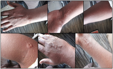 At the time of examination, patient had severe pruritis all over the body (Figure 1) including lips. Patient was conscious and able to answer to questions. A complete physical examination was unremarkable except hypotension (blood pressure was 100/60 mm of Hg). Patient also had the feeling of lightheadedness and fainting. Tightness in the throat, dyspnoea, rhinorrhoea, angio–edema, nausea and vomiting were absent. Patient came at the initial stages of anaphylactic reaction and immediately Ayurvedic medicines have been given (patient has preferred Ayurvedic medicines even though antihistamines, corticosteroid injections etc are available at that time). After the administration of Ayurvedic medicines, the anaphylactic reaction has resolved completely within one hour. After few days of the anaphylactic reaction, routine hematological, biochemical investigations, renal function tests and liver function tests were carried out and they all are found within normal limits. AEC (Absolute eosinophil count) was 3000 / cu mm. Erythrocyte sedimentation rate (ESR) was 15 mm in one hour. Serum cholesterol was 266 mg / dl, serum LDL (low density lipoprotein) was 191 mg /dl, cholesterol / HDL (high density lipoprotein) ratio was 5.61 and serum LDL / serum HDL cholesterol ratio was 4.02, all of which indicates dyslipidaemia (22.09.2016). Skin prick testing and Serum IgE (immunoglobulin E) testing were not conducted.
