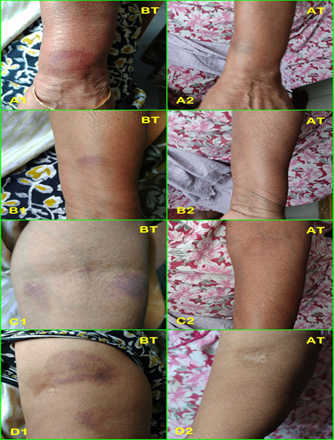 BT-Before therapy; AT-After therapy (after completion of one year of therapy); A1&A2-Ecchymotic patches on the left dorsal aspect of the wrist before and after therapy respectively; B1&B2- Ecchymotic patches on the left forearm before and after therapy respectively; C1&C2- Ecchymotic patches on the left antecubital fossa before and after therapy respectively; D1&D2- Ecchymotic patches on the left lateral aspect of the arm before and after therapy respectively;