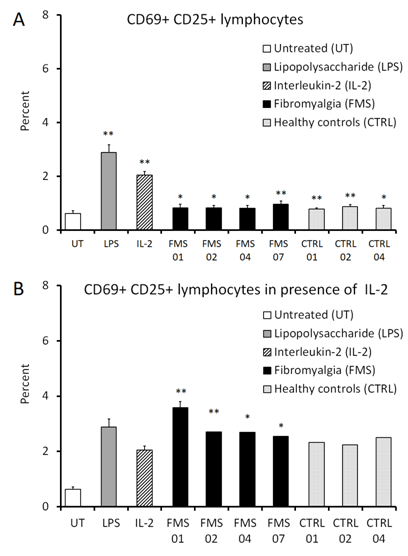 Percentage of CD69+CD25+ double-positive lymphocytes in human peripheral blood mononuclear cell (PBMC) cultures treated for 24 hours with supernatants from 7-day erythrocyte cultures in either the absence (A) or presence (B) of Interleukin-2 (IL-2, 100 IU/mL). Lipopolysaccharide (LPS) was used as a positive control (10ng/mL) for increase in the percentage of CD69+CD25+ double-positive lymphocytes. In the absence of IL-2, 7-day erythrocyte culture supernatants from both fibromyalgia (FMS) patients and healthy controls led to a slight increase in the percentage of CD69+CD25+ double-positive lymphocytes when compared to untreated cultures (A). In the presence of IL-2, only 7-day erythrocyte culture supernatants derived from FMS patient cultures led to an increase in the percentage of CD69+CD25+ double-positive lymphocytes when compared to cultures treated with IL-2 alone (B). Data presented as mean ± standard deviation from quadruplicate cultures using PBMC from a healthy human donor. *P<0.05; **P<0.01.