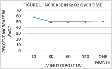 Miley was among the first to unequivocally document the effects of biophotonic treatment of peripheral blood oxygen saturation in a large group of human subjects over a prolonged duration.4 In his studies, he applied the UV at 260 nm wavelength for < 30 minutes and recorded blood SpO2 periodically for up to one month or more following the treatments. A summary of his findings is depicted in Figure 1 below and indicates that SpO2 became elevated to near 100% saturation within minutes of UV exposure and remained higher for at least 30 days or more following treatment.