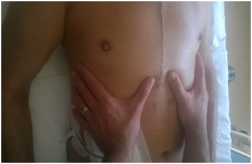 Patients undergoing implantation of L-VAD, usually present with a previous history of sternotomy cardiac surgery and the positioning of a pacemaker / implantable cardioverter defibrillator (PM / ICD) (Figure 2 & 3). These patients are subject to very long periods of hospitalization, because their condition must be stable and they must be able to handle the replacement of external batteries before being discharged to home. These patients have to undergo strict medical supervision and can access the cardiovascular rehabilitation programs; the results of functional recovery are very slow but verifiable.6,9–11 The patient with L-VAD system is subject to a number of complications both during the hospital stay, and at home, in particular anemia, respiratory problems, recurrent infections in the insertion of the VAD cable, and on rare occasions, thrombosis.5–7 In this study we evaluated the presence of osteopathic dysfunctions in patients with L-VAD, as we have verified that a text citing osteopathic issues is missing from the existing literature.