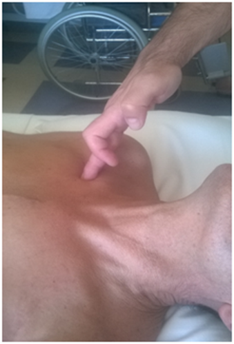 Figure 12 Under the axilla, the operator places the thumb with cranial direction towards the coracoid insertion of the muscle, with oblique vector.