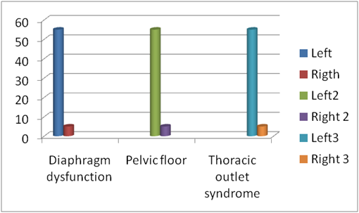 Of a total of 60 patients, 55 had a more pronounced left diaphragmatic motor dysfunction, while the remainder showed a major issue on the right. Osteopathic evaluation indicated that the side of the dome in diaphragmatic dysfunction is related to the hypertonia of the ipsilateral muscle of the pelvic floor. In palpating the floor of the mouth, and externally the medial branch of the mandible, we see the same phenomenon, that is to say an increase of tone that reflects the diaphragmatic side which is more in deficit.
