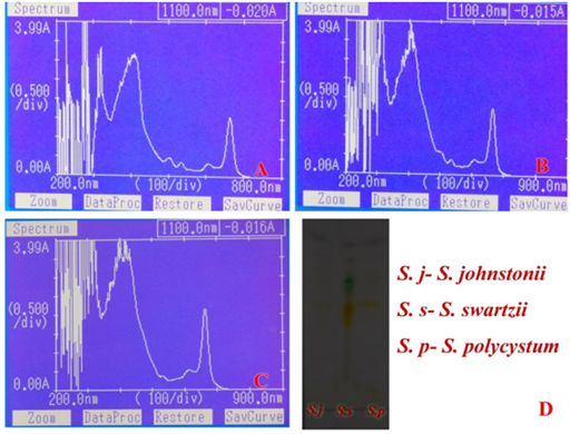Thin layer chromatography was used to separate the pigments and find out the Rf value of the photosynthetic pigment fucoxanthin present in S. johnstonii, S. swartziiand S. polycystum. Pigments in the mixture are separated on the basis of their differences in solubilities and partition co–efficient in a binary solvent system. Silica gel coated plates (Merck – 10×6 cm) and n–hexane: acetone (HiMedia, Mumbai, India) was used as mobile phase for the separation with a ratio of 7:3.19