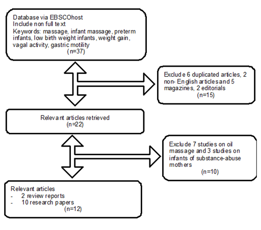 To obtain evidence, a systematic search for relevant studies was performed on the following databases: Ovid MEDLINE, CINAHL, Proquest, Sciencedirect, Cochrane Library, and PubMed. The search used a combination of keywords related to preterm infant (preterm infant, low birth weight), intervention (infant massage, massage), and outcome measures (weight gain, vagal activity, gastric motility). The studies identified for inclusion were narrowed down to full text articles written in English. Studies that compared the effectiveness of different massage oils were excluded; this was because massage oil brought out concerns, such as allergic reactions and a change of triglyceride and fatty acid profile.9,10 A total of 12 articles were selected by two independent reviewers (Figure 1).3,6,8,11-19 The Jadad scale20 was utilized to assess the quality of the randomized controlled trial (RCT) studies in this paper. The total score of the instrument is 5. A higher score indicates less bias. A score equal to or less than 2 indicates low quality, whereas a score equal to or higher than 3 indicates high quality. All RCTs selected in this study scored 3 or above on the Jadad scale (Table 1).