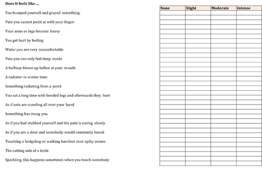 The first version was tested in 40 adults. The distinctive feature was the connection of 17 pictographic sentences to the best fitting item out of 25 presented items. In the first version of the CNSQ sentences for the items warm, pricking, throbbing and stinging were recognized by more than 70% of the tested adults. Between 50 – 70 % of our test persons identified items fading, tingling, twinge, spreading, pressure, deep ache and heavy. The most difficult items to detect from our sentences were sharp, numb, hidden pain and bruised. The worst identification rate with 37,5 % of the participants showed hidden pain.