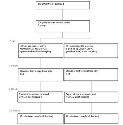 Secondary endpoints: 1) The Impact on WOMAC pain and function scores after an initial 6weeks of active or placebo treatment 2) The Impact on WOMAC stiffness after 6 and 12weeks in active and placebo treated patients. 3) The impact of active and placebo treatment on PGAD after 6 and 12weeks treatment. 4) The impact of active treatment and placebo on quality of life using SF-12 questionnaires after 6 and 12weeks treatment. 5) Blood lipid levels and the inflammatory marker CRP using normal laboratory routine. 6) The number of side effects reported in each group.