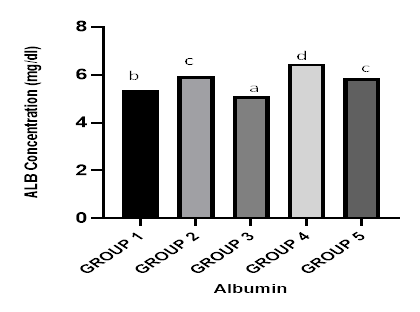 The serum samples of the rats were analyzed for various liver function parameters, including Aspartate Aminotransferase (AST), Alanine Aminotransferase (ALT), Alkaline Phosphatase (ALP), Total protein (TP), and Albumin (ALB) using a UV/ visible spectrophotometer.