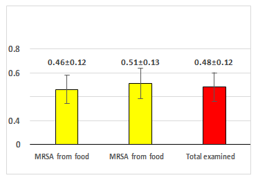 MRSA biofilm–associated infections are difficult to be eradicated because the biofilm is strongly resistant to wide variety of antibiotics and the host immune response.3 The vast majority of food–borne outbreaks caused by antimicrobial–resistant pathogens are the result of the consumption of contaminated foods of either animal–origin or multi–ingredient foods.42 In the present study, MAR index among food strains, MRSA from meat showed the highest value as 0.61±0.1 (Figure 1), while among food worker strains, fingernail strains showed 0.57±0.14. Figure 2 and the overall MAR index of tested strains was 0.48±0.12 (Figure 3). The tested MRSA strains had very high MAR index value since MAR index value just≥0.2, is considered high40 and might be originated from environments with misuse of antibiotics where resistance developed and spread,43 rather than harboring both mecA & icaA genes (Figure 4). All tested MRSA strains showed positive congo red testing concluding that these tested strains were biofilm producing MRSA pheno as well as genotypically. So, these nineteen MRSA strains represent different hazard sources threating public healthcare classified as multidrug resistant, biofilm producer foodborne pathogens.