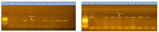 Figure 4Agarose gel electrophoresis of PCR for Mec A gene at 310bp and icaAgene at 1315bp encoded in MRSA recovered from food and food workers.