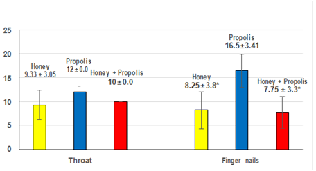 Honey and propolis minimum inhibitory concentration (MIC) determination: honey or EEP was dissolved in sterile deionized water to prepare a stock solution of 20% v⁄v honey immediately before each use. Further dilutions were prepared by adding honey and sterile deionized water to sterile 10–ml volumes of molten double–strength nutrient agar at 50°C and pouring immediately to produce a range of plates containing honey at 1% (v⁄v) intervals between 0 and 20% v⁄v.41 For testing the synergistic effect of both tested apiproducts, honey and EEP were added as described above but with half amount for each to obtain the final concentration of mixed products. Plates were dried at 37°C for 15 min before use. McFerland standards 0.5% from overnight broth culture of MRSA was used for MIC determination as each MRSA standard dose was inoculated onto every prepared concentration of api– product plate. Plates were incubated at 37°C for 24h before visual assessment.41
