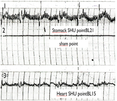 Figure 2 patient with stomack ulcer. EG trace of 1. Stomack SHU point (BL21); 2. Sham(non-active point) and 3. Heart SHU point (B115).