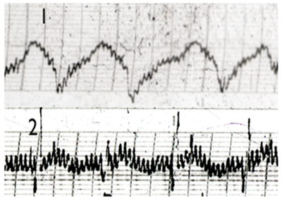 Figure 4 EG trace of Heart SHU acupuncture points (BL 15): 1. Healthy person; 2. Patient with cardiac arrhythmias.