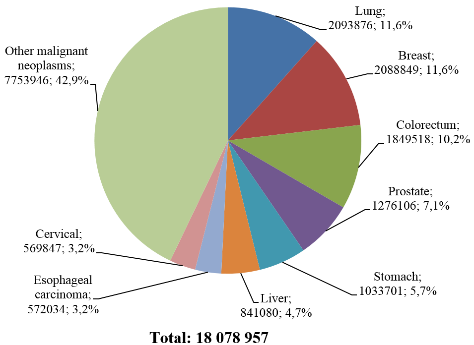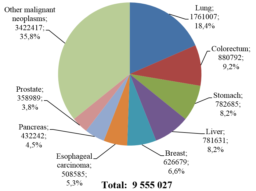 The scale and globality of oncopathology problems can be clearly seen in the data of the world statistics, which show an increase in the number of registered MN patients, which is about 12million new cases annually and more than 6.5million deaths, with a growth rate of more than 2%, which exceeds by 0.5% the growth of the world population.1–4
